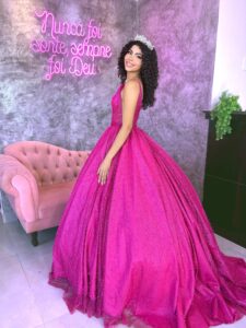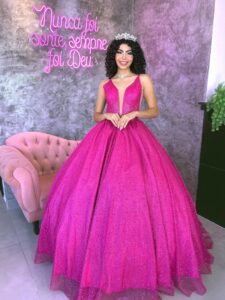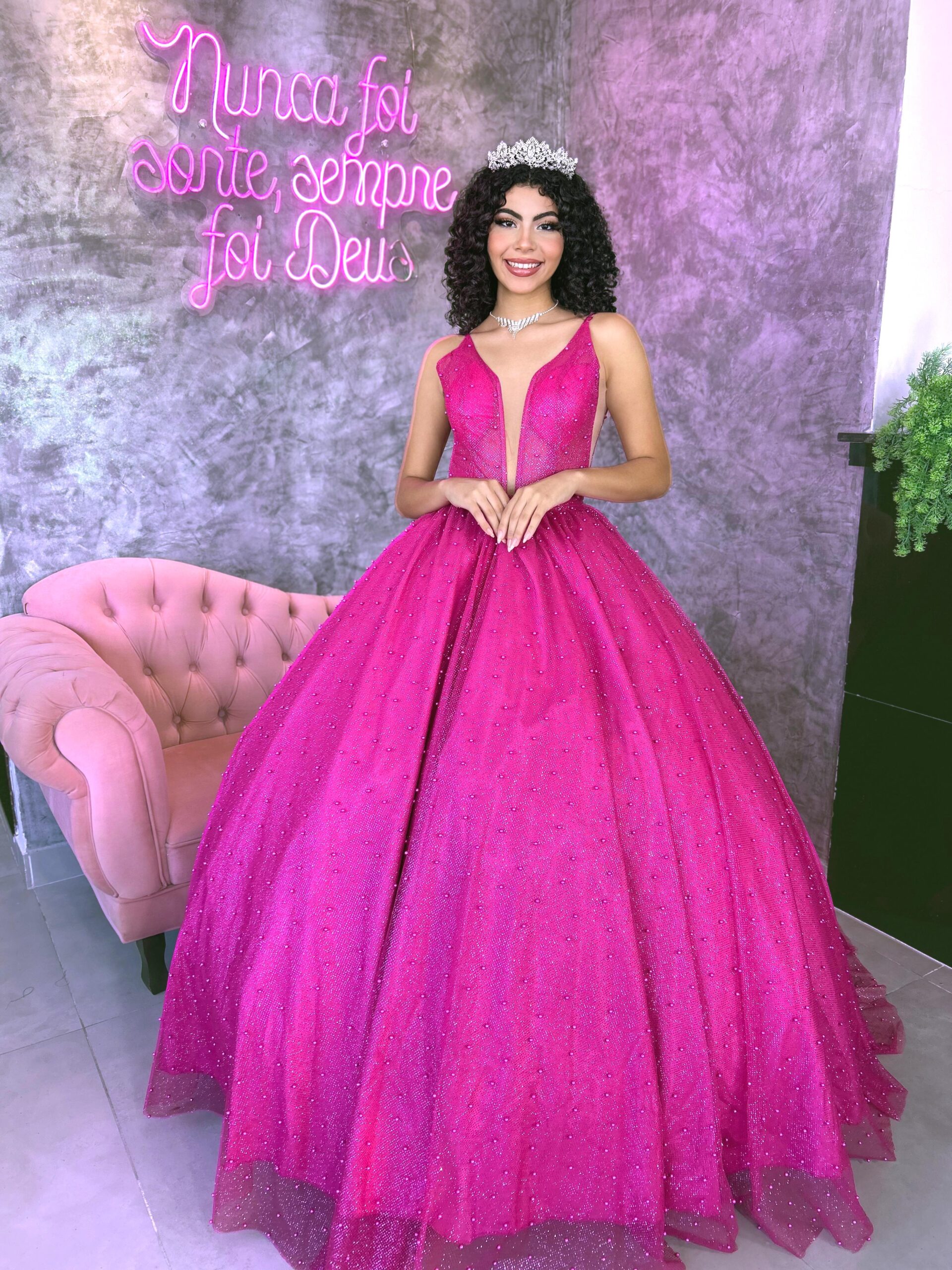 Vestido de Debutante Longo Rosa Fúcsia com Pérolas